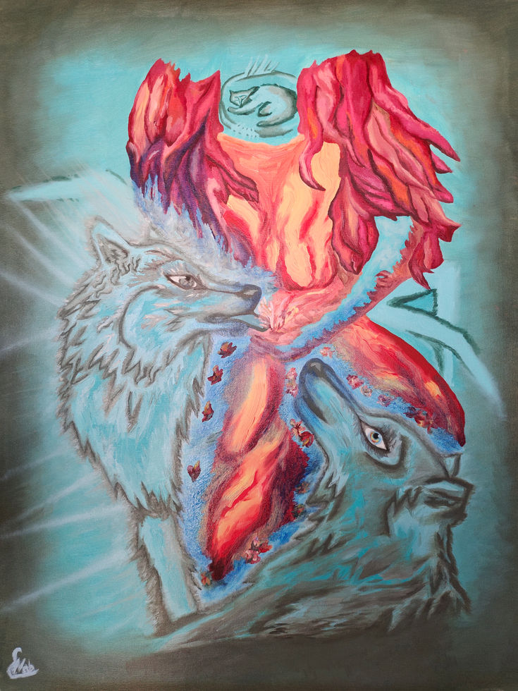 A turning point in my personal mythology. Once you stand through fear inside a fiery trial, you are initiated into a wild pack. What once threatened becomes protection. The figure of fear and chaos at the center turns into the calmness of blue, being transformed through the interaction with the wolves. Two wolves guard the transformation: one dreamy and luminous, one passionate and fiery. Light and shadow. Ideal and raw. Both are needed. You choose which one you feed. At the center, the fiery figure reveals her feminine spider-essence. The archetypes transform each other. The weaving begins. Oil on canvas - 60x80